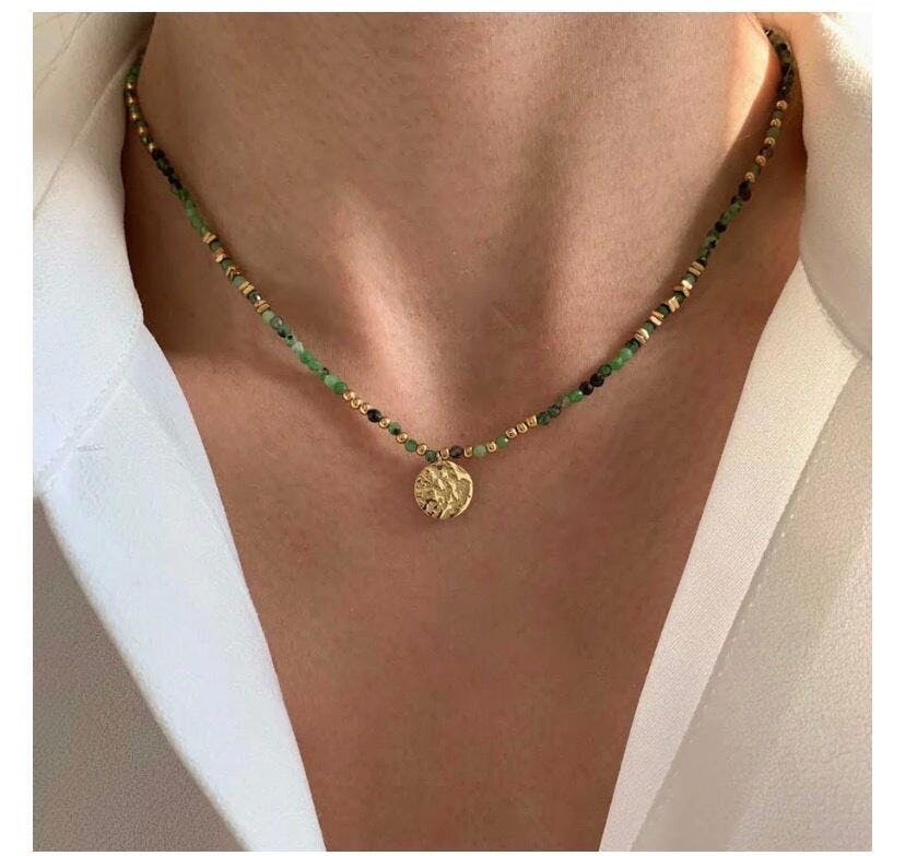 Dieses elegante Damenarmband kombiniert feine, natürliche Tsavorit-Perlen mit kleinen goldfarbenen Akzenten und einem robusten Edelstahlverschluss. Die zarten grünen Steine verleihen dem Armband eine frische, edle Ausstrahlung und harmonieren perfekt mit anderen filigranen goldenen Armbändern – ideal zum Kombinieren und Layern.